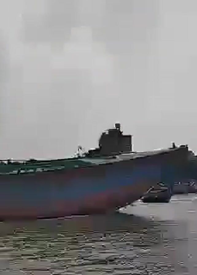 gray, long, flat-topped boat moving on the water. The boat has a canopy covering a cabin-like structure in its rear. The sky is gray and overcast. There are other boats and structures visible in the background.