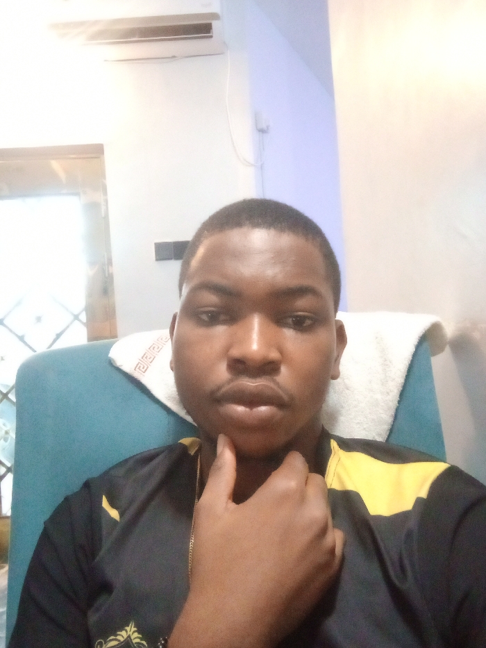 The scene captures an adult male, of dark complexion with short dark hair and a mustache, seated indoors in the city of Igrwre-Ovie, Nigeria