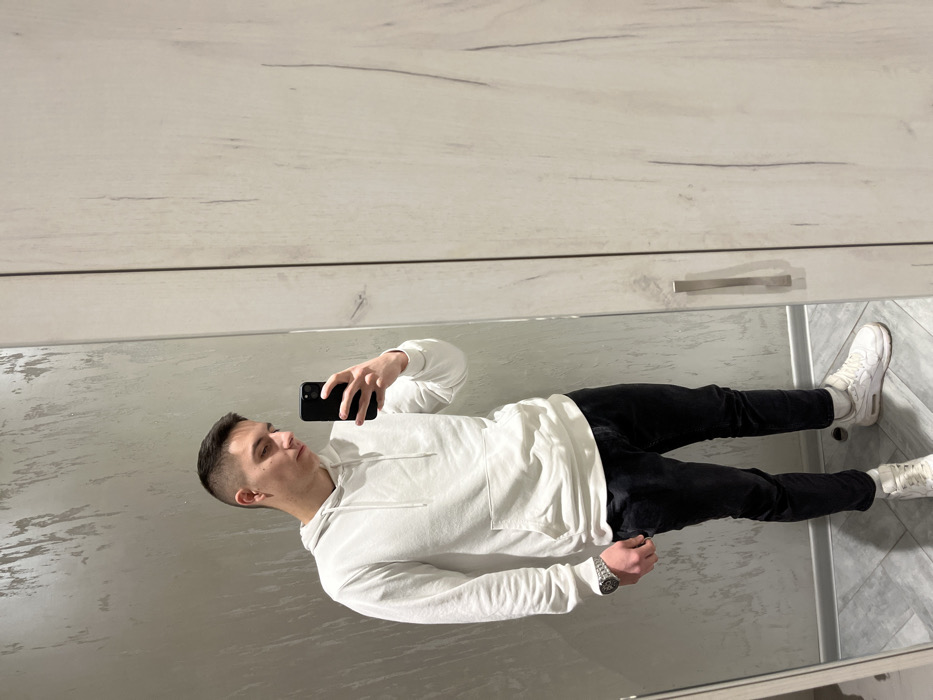 The image depicts a male individual taking a full-body mirror selfie indoors, in what appears to be a private residence or a retail changing room located in the city of Plovdiv, Bulgaria. The subject, a male in his late teens or early twenties, stands facing a large rectangular mirror. He has short, dark hair, faded on the sides, and a small, dark stud in his left earlobe. He is dressed in a white long-sleeved hooded sweatshirt featuring a front pouch pocket, dark-colored fitted pants, and white athletic shoes with visible soles. A silver-toned watch with a metal link bracelet is worn on his left wrist. The male holds a dark-colored smartphone in his right hand, angled towards the mirror to capture his reflection. His gaze is directed downwards, towards the phone or his own image. The wall reflected behind the individual is light grey with a textured, mottled finish. To the right of the mirror, a light-colored, wood-grain patterned wardrobe or cabinet with a vertical silver-toned handle is visible. The floor is covered with light grey rectangular tiles arranged in a chevron pattern, with a white baseboard visible at the wall-floor junction.