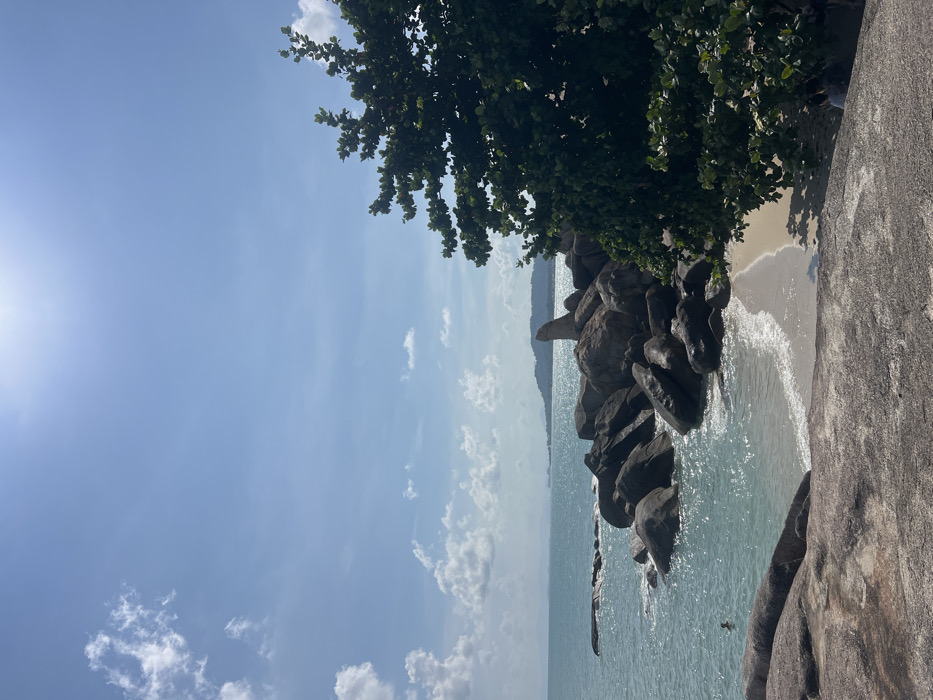 A rocky shoreline meets the turquoise sea under a bright sky with scattered clouds. Large, dark boulders line the coast, interspersed with patches of sandy beach where waves gently break. A leafy tree branch overhangs the scene. The image is taken at an angle, showcasing the depth of the coastline and the vastness of the sky.