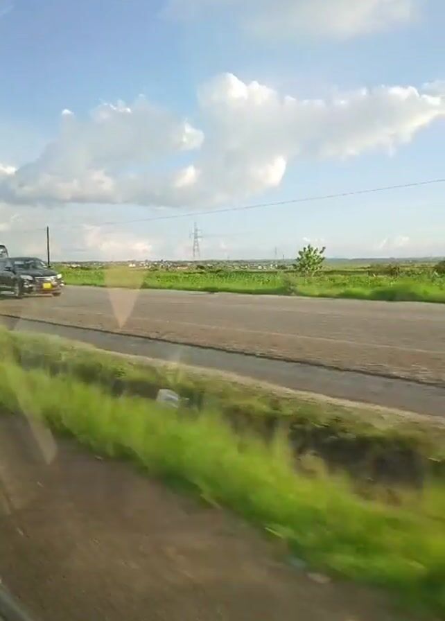 A car is traveling down a road on a sunny day with a blue sky and scattered white clouds. Power lines and towers are visible in the distance. Cars pass in the opposite direction. Green grass grows along the side of the road. The view is from inside the car, looking out the window.