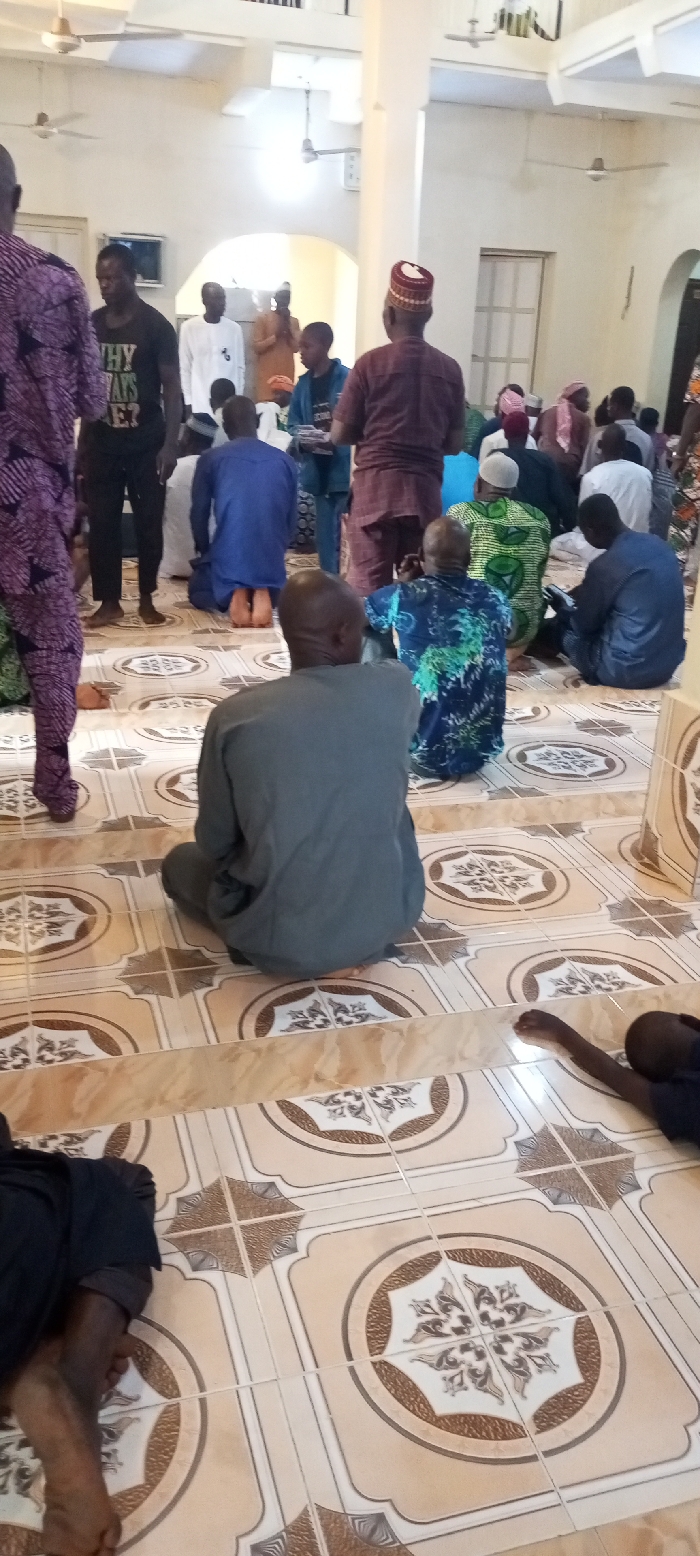The image depicts an indoor gathering of approximately 20-30 adult males within a large building in Aramoko-Ekiti, Nigeria, consistent with a mosque or religious hall