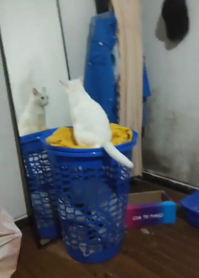 A short, shaky video shows a white cat perched atop a blue laundry basket
