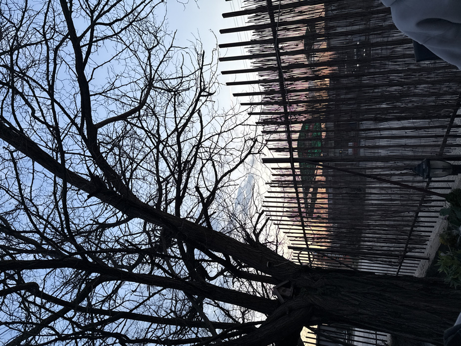 This image captures an outdoor scene in Tsalapitsa, Bulgaria, under twilight conditions, likely dusk. A large, bare deciduous tree, silhouetted against the sky, dominates the left side and extends into the upper frame with its intricate branches. A small, wooden birdhouse is affixed to the tree's trunk. The sky, visible through the branches, transitions from a pale blue overhead to a lighter hue with faint pink and orange tints near the horizon. A tall, dark fence constructed of numerous vertical, irregularly shaped slats, possibly wood or bamboo, extends horizontally across the mid-ground. Beyond this fence, a building with a distinctive, multi-tiered green roof is partially visible, backlit by the sky. In the immediate foreground, on the lower left, some dark foliage is present. A black, decorative outdoor lantern or lamp post stands in front of the fence towards the bottom center. On the far right, the upper arm and shoulder of a person wearing a light grey hooded sweatshirt are partially visible.