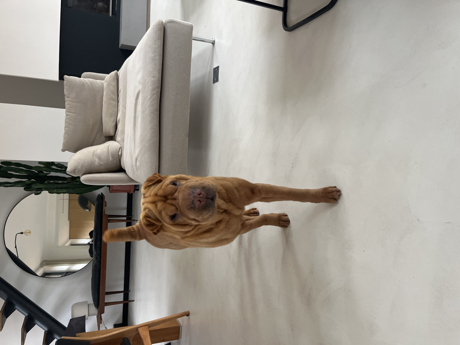 - "This image depicts a light brown Shar-Pei dog standing on a pale grey floor in a modern interior, identified as being in Carency, France" by FM-2aYl13, licensed under CC BY 4.0