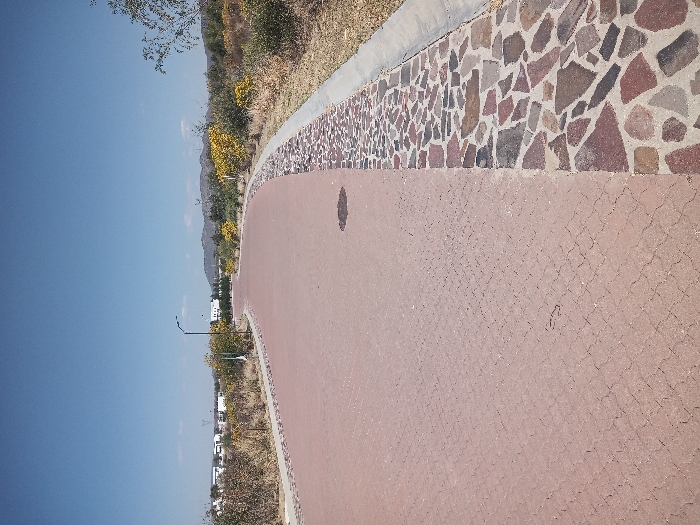 The image displays an outdoor scene in La Venta, Mexico, under a clear, bright blue sky with minimal, faint white clouds. A reddish-brown paved path, constructed from interlocking zig-zag pavers, extends from the foreground into the distance, curving to the right. A dark, circular stain is present on the paver surface in the mid-ground. To the immediate right of the main paved path, a decorative strip features irregularly shaped, multi-colored stones (ranging from red to grey and brown) set into a lighter-colored mortar. This strip is bordered on its right by a light grey concrete curb. Beyond the curb, the ground consists of dry, light brown earth and sparse vegetation, including bushes with green foliage and bright yellow flowers. On the left side, the main path is bordered by a lighter-colored, possibly gravel or stone, shoulder, beyond which similar dry vegetation and green bushes are visible. A black street lamp post with a curved arm is positioned on the left side of the path in the mid-ground. In the distant background, rolling hills are present, along with several white or light-colored buildings and faint utility structures. No individuals, animals, or vehicles are present in the scene.