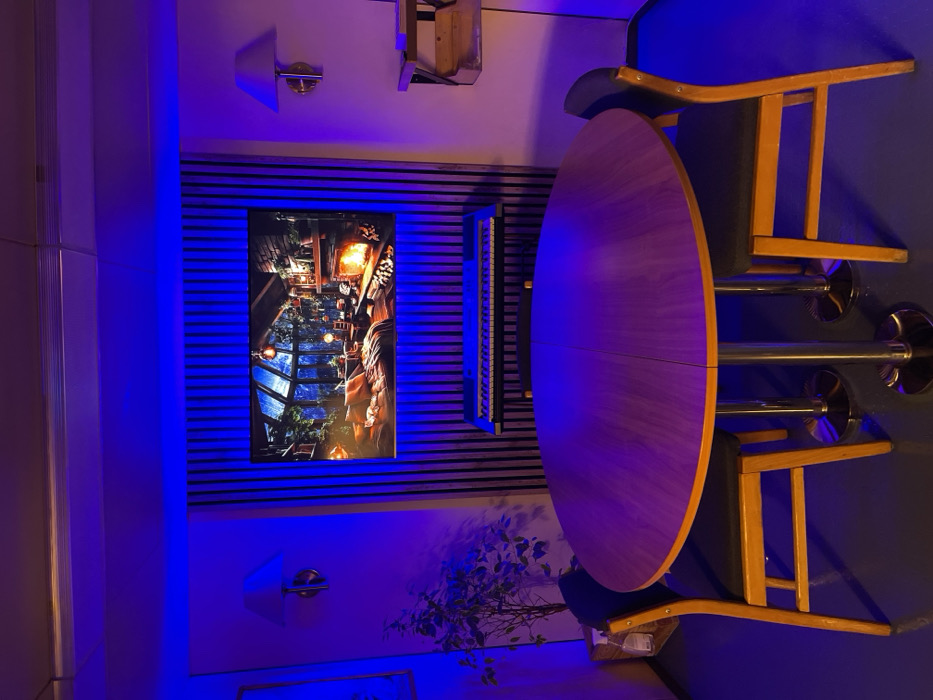 - "This image depicts an indoor room, illuminated predominantly by blue ambient lighting, originating from an unseen source, likely LED strip lighting along the ceiling perimeter, casting a strong blue tint over all surfaces and objects" by FM-9uyr63, licensed under CC BY 4.0
