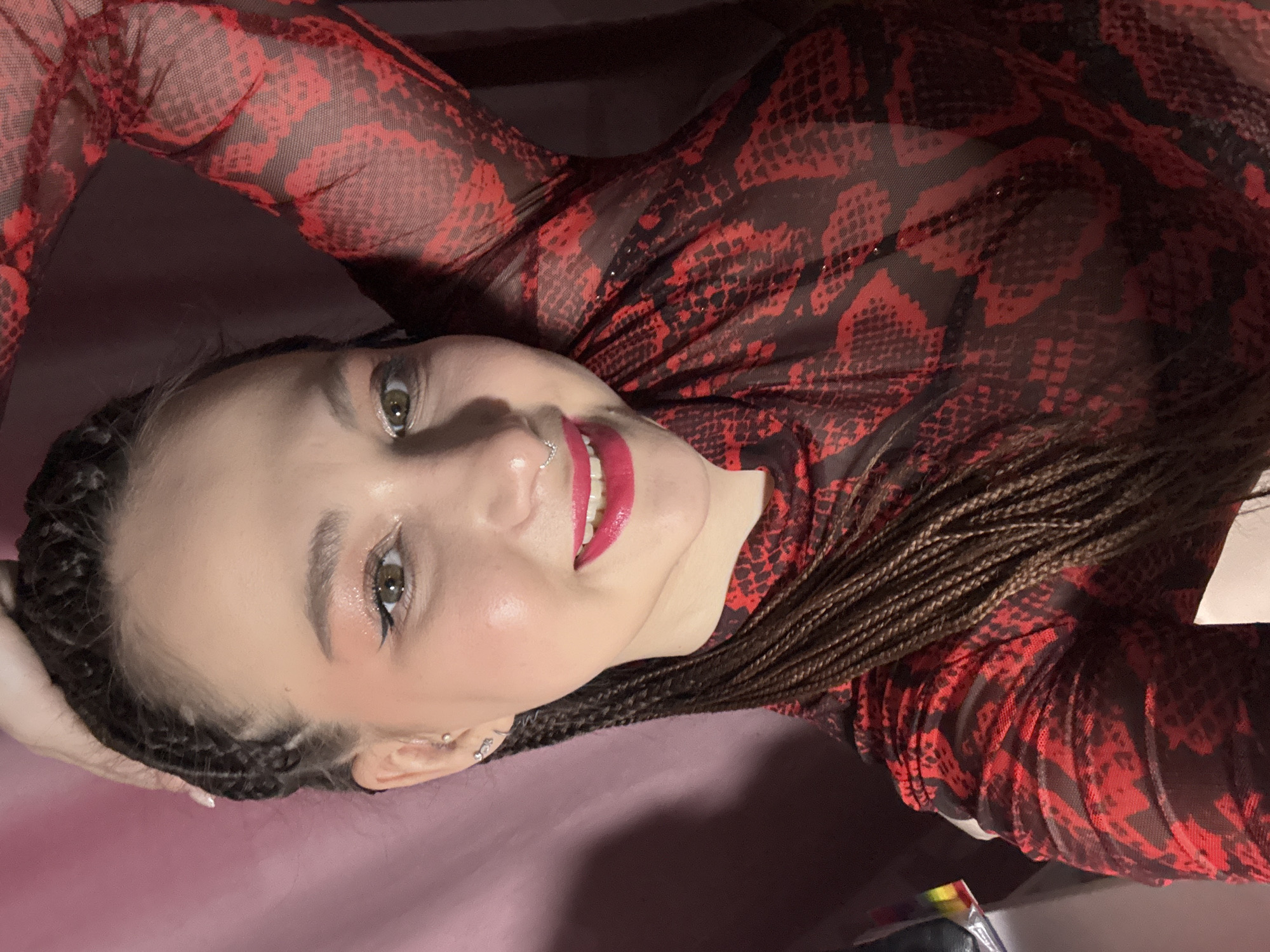 A young woman lies on a pink surface, angled toward the viewer. She has fair skin, light brown eyes, and dark brown hair styled in braids. She is wearing red lipstick and has a silver nose ring and multiple earrings. Her attire consists of a sheer red and black patterned top. The background is dark and indistinct. There is no indication of the location being in Saratov, Russia.