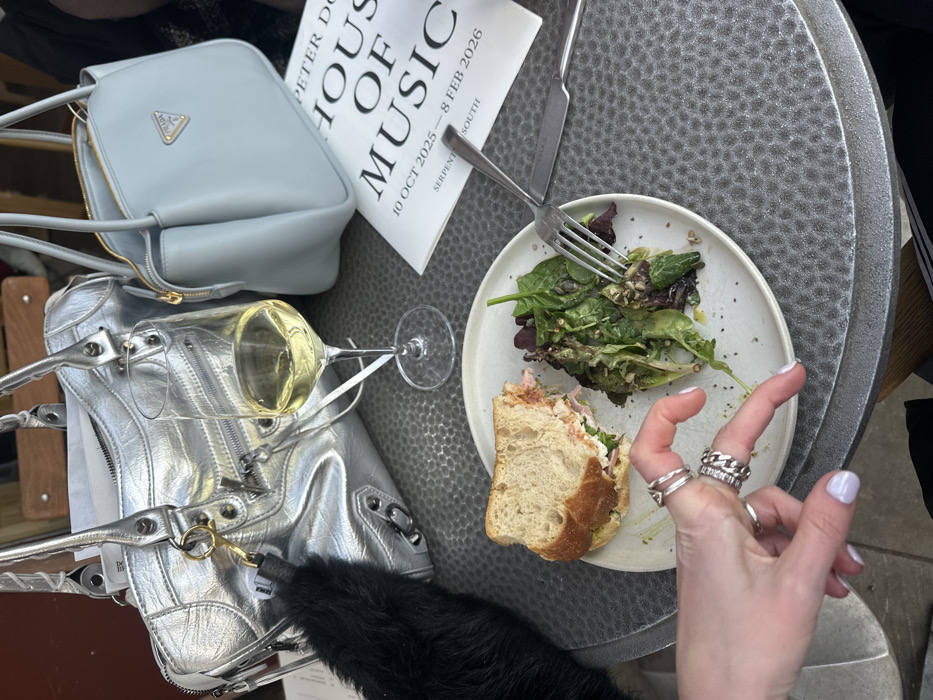 The scene depicts a casual outdoor dining setting in the City of Westminster, United Kingdom, specifically at or near Serpentine South, as indicated by printed material. A textured dark grey metallic table holds a white plate containing a half-eaten sandwich with a light-colored filling and a mixed green salad with seeds, speared by a silver fork. A knife rests beside the plate. To the right of the plate, a wine glass contains a clear pale yellow liquid. Two handbags are prominently displayed: a crinkled silver bag with multiple zippers and buckles on the left, adorned with a black fluffy charm, and a light blue Prada shoulder bag with a gold logo on the right. A white brochure titled "PETER DO HOUSE OF MUSIC" with dates "10 OCT 2025 – 8 FEB 2026" and "SERPENTINE SOUTH" is visible behind the light blue bag. A person's left hand, with light purple nail polish and multiple silver rings on the index, middle, and ring fingers, is positioned in the foreground, with the index and middle fingers slightly separated. A dark, possibly fur-trimmed, sleeve is visible on the far left, belonging to the same individual.