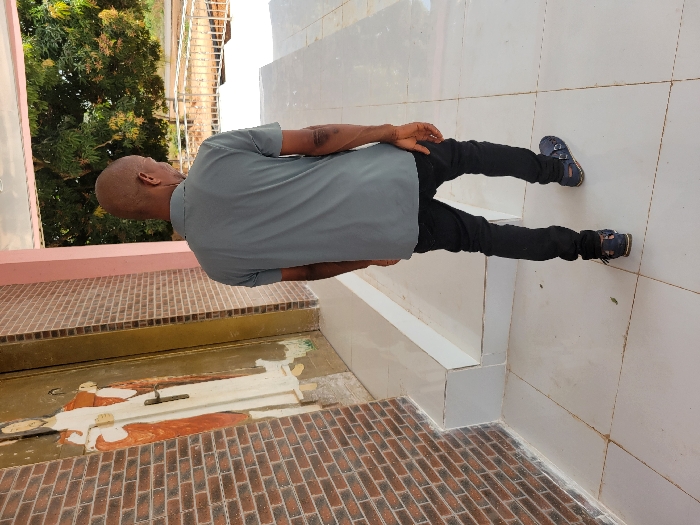 In Ebenebe, Nigeria, a brightly lit outdoor scene depicts a single male subject walking away from the camera within a tiled covered walkway. The individual has a shaved head, wears a grey short-sleeved polo shirt, black trousers, and dark blue open-toed sandals. To the left, a reddish-brown brick wall features a tall, golden-framed door, upon which is a relief or painted depiction of a robed figure, possibly a saint or Jesus, holding a staff. The walkway floor consists of large, light-colored tiles, and the roof overhead is supported by light pinkish beams. Beyond the covered area, green tree foliage is visible in the mid-ground, with a metal fence and an open, lighter-toned area forming the distant background.