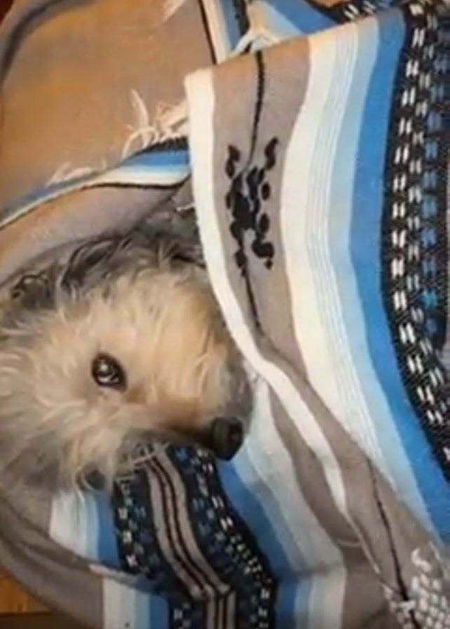 A small, tan, furry dog is nestled within a folded, striped blanket. The blanket features alternating bands of blue, grey, and white. The dog's head is visible, with one eye open and gazing towards the viewer. The blanket appears slightly frayed at the edges.