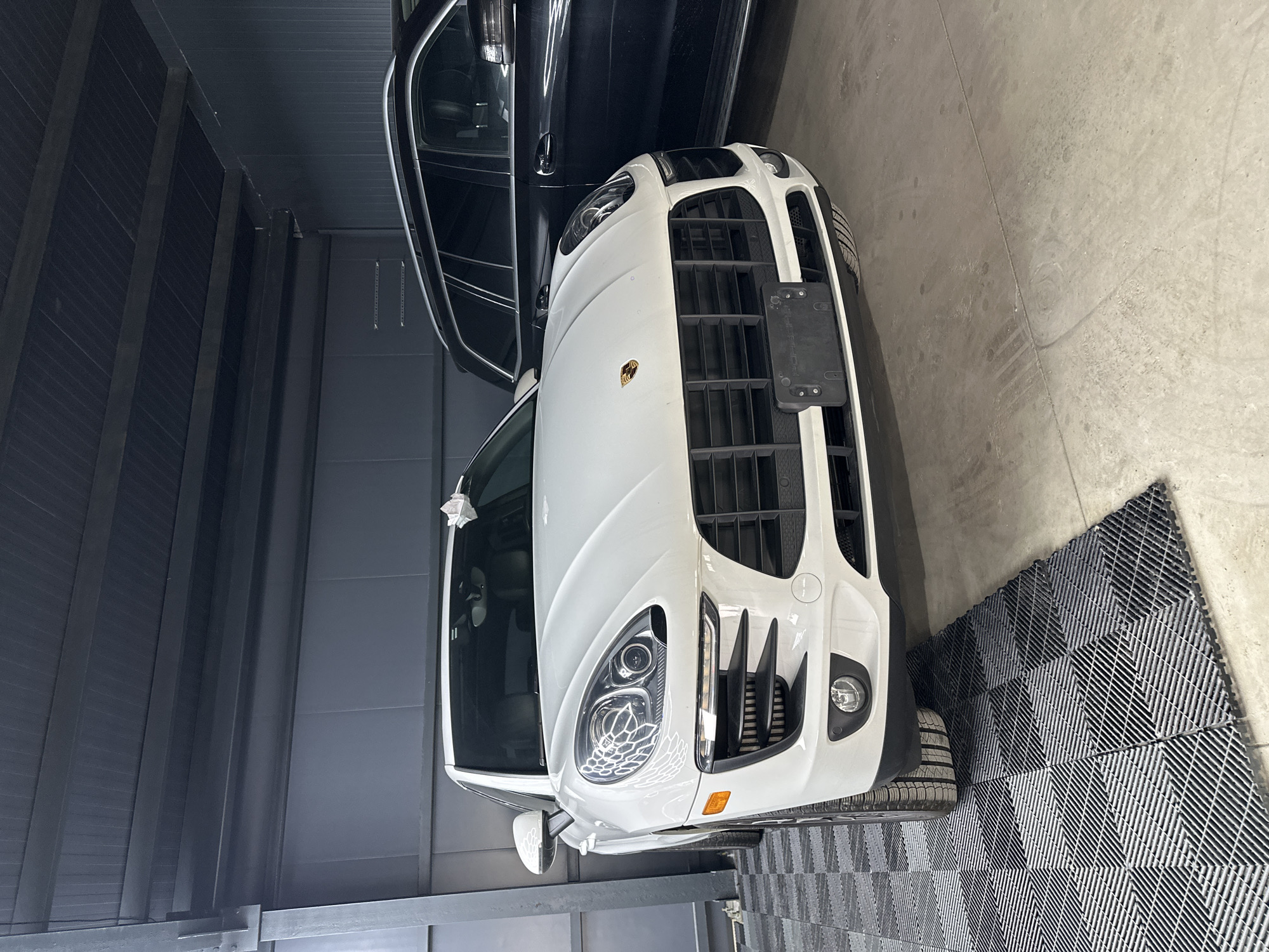 The photograph shows the front end of a white Porsche Macan parked in what appears to be a garage