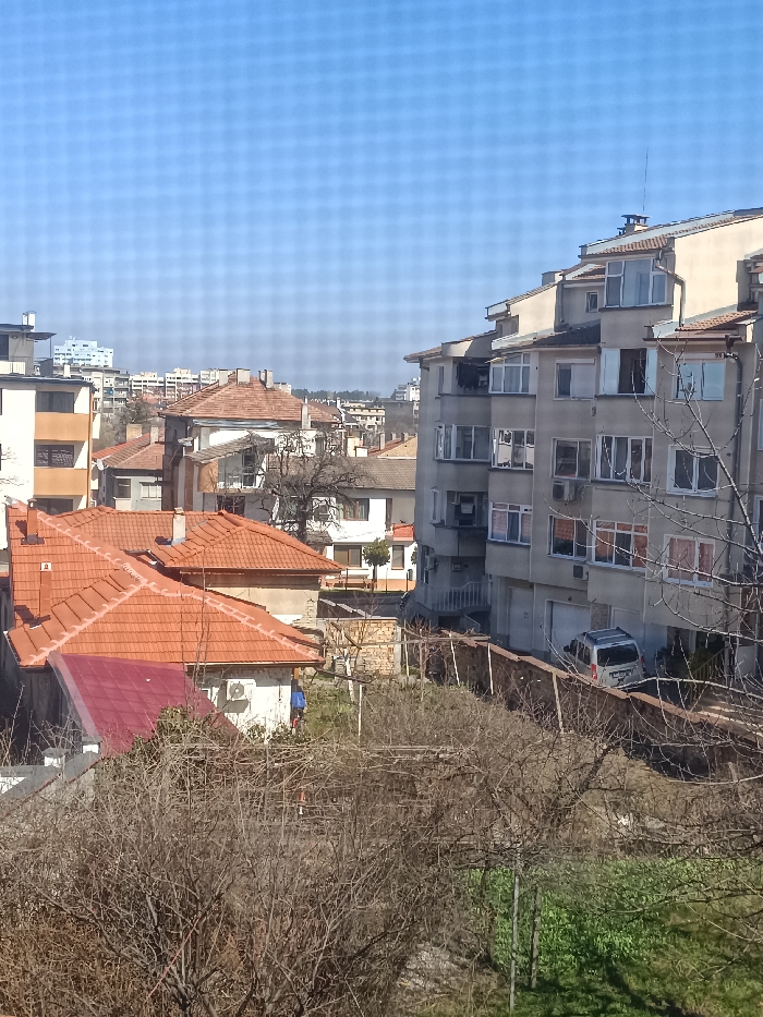 This image presents an elevated view of a residential area in Targovishte, Bulgaria, under a clear blue sky, observed through a screen or mesh evident as a grid pattern. The scene is illuminated by natural light, suggesting daytime. In the foreground, the lower half of the image is dominated by a dense cluster of bare deciduous tree branches and shrubs, indicative of late winter or early spring. To the lower right, a patch of vivid green ground cover is visible. Two houses with orange-tiled roofs are prominent on the left, one featuring a distinct red-tiled section. A white building with an external air conditioning unit is situated below these roofs, with a blue-clad object or figure partially discernible near it. The mid-ground features a multi-story apartment building with a light beige facade on the right, characterized by numerous windows, some equipped with external blinds, and several enclosed balconies. An air conditioning unit is affixed to its exterior. A silver/grey minivan is parked diagonally in front of a ground-level garage entrance of this building, partially obscured by a low dry-stone wall that extends horizontally across the scene. Further into the mid-ground, additional single-family houses with orange-tiled roofs and bare trees are interspersed among the larger structures. The background reveals a continuation of the urban landscape with more distant multi-story buildings, suggesting a broader city environment. The upper portion of the image is entirely occupied by a uniform, clear blue sky. No direct human interaction or active movement is clearly depicted.