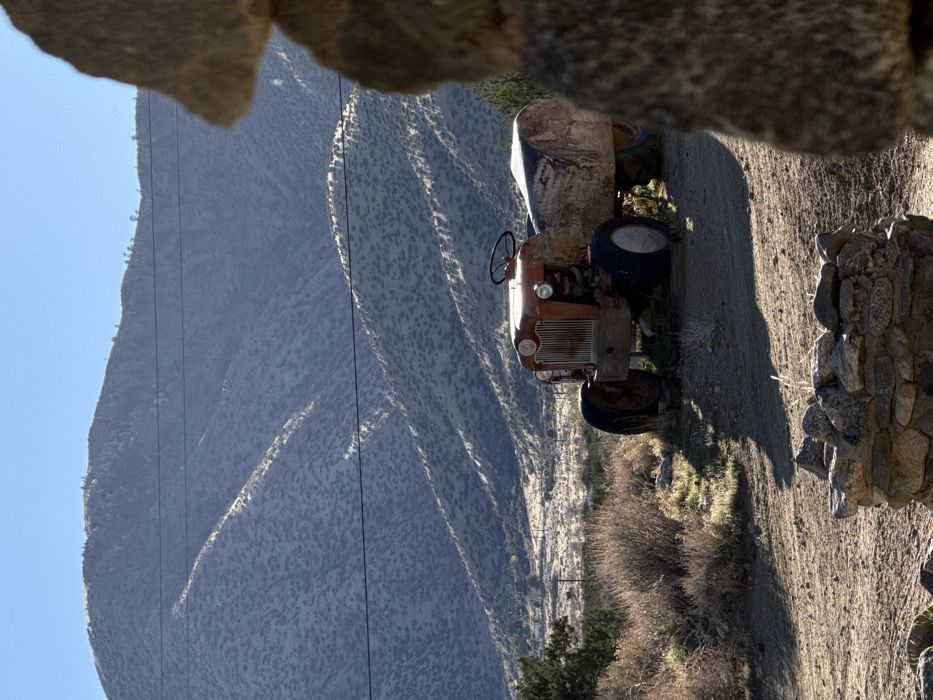 An old, orange tractor sits on a dirt path. A mountain slopes down in the background under a bright blue sky. Power lines stretch across the scene. The tractor is partially obstructed by rocks at the top of the frame. A pile of stones is visible on the right. Low brush and small trees grow along the path. The landscape is arid and rocky.