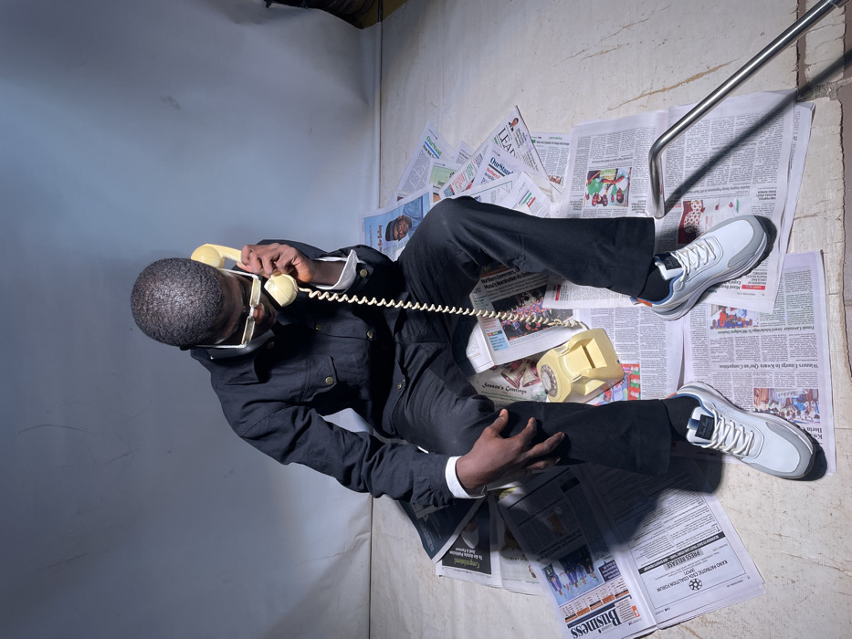 The image portrays a lone individual, appearing male, seated on a collection of newspapers spread across a light-colored floor, within what appears to be a studio setting in the city of Barakin Akawo, Nigeria. The individual has dark skin, short, closely cropped hair, and wears white-framed eyeglasses. He is dressed in a dark, long-sleeved shirt or jacket with brass-colored buttons and visible white shirt cuffs, dark trousers, and white, grey, and blue athletic shoes with black socks. His right hand holds a cream-colored, vintage landline telephone receiver to his right ear, indicating active use. The coiled telephone cord extends from the receiver, and the cream-colored, rotary-dial phone base rests on the newspapers to the left of his left leg. His left hand rests on his left thigh. Various newspapers with visible text and images, including a "Business" section headline, form the surface he is seated upon. A curved, reflective metal bar lies on the floor to the right of his right foot. The background is a plain, light grey backdrop.