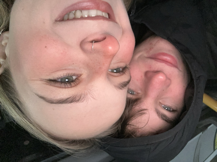 Two individuals are closely positioned with their faces near each other. The person on the left has blonde hair, fair skin with freckles, blue eyes, and a nose ring. They are smiling, revealing their teeth. The person on the right is wearing a dark hoodie, and their face is partially obscured by the hood. They also have fair skin and blue eyes. The image appears to be rotated slightly, and the composition focuses on the faces of the two people.