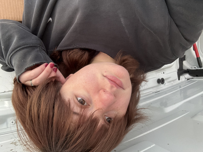 A single individual, appearing female, is depicted from the chest up within the white, utilitarian interior of a vehicle, likely a van or cargo space. The individual has reddish-brown, medium-length hair with bangs and fair skin, showing some freckles. A silver-colored nose ring is visible on her left nostril. She wears a faded dark gray crew-neck sweatshirt, exhibiting wear along the collar and cuffs, with a white Nike swoosh logo visible on the lower right front. Her left hand is raised, with fingers gently touching her hair near her left ear; the nails are painted dark red, and a silver-colored ring with an intricate design is present on her left ring finger. The individual's gaze is directed upwards and to the right of the frame, with a neutral to contemplative expression. The background consists of white paneled walls and a ceiling with visible structural contours. A red-handled tool is partially visible in the lower-left corner of the frame, leaning against the wall. The image provides no specific visual information to confirm the location is Cortona, Italy.