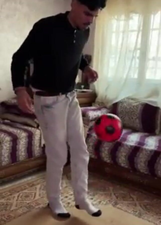 A young man is juggling a red and black soccer ball with his feet, knees, and head, in a living room setting