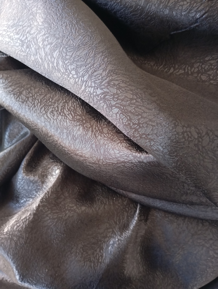 The image depicts a close-up of a dark, irregularly folded material