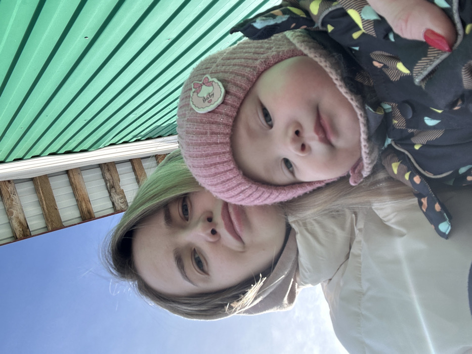 This outdoor image features an adult female holding an infant. The adult female, on the left, has light-colored hair with a subtle green tint and is wearing a light-beige puffer jacket. Her face is visible, looking towards the camera with a neutral expression. The infant, held by the adult on the right, wears a pink knitted hat with a "Hello Baby" emblem and a dark winter overall patterned with yellow, blue, and orange shapes. The infant also looks towards the camera. The background includes a clear blue sky on the upper left, above a wooden structure with visible beams, and a green corrugated metal wall with horizontal lines on the upper right. The scene is illuminated by bright natural light, indicating daytime. The event occurs outdoors in Азинский, Russia, adjacent to a building structure.