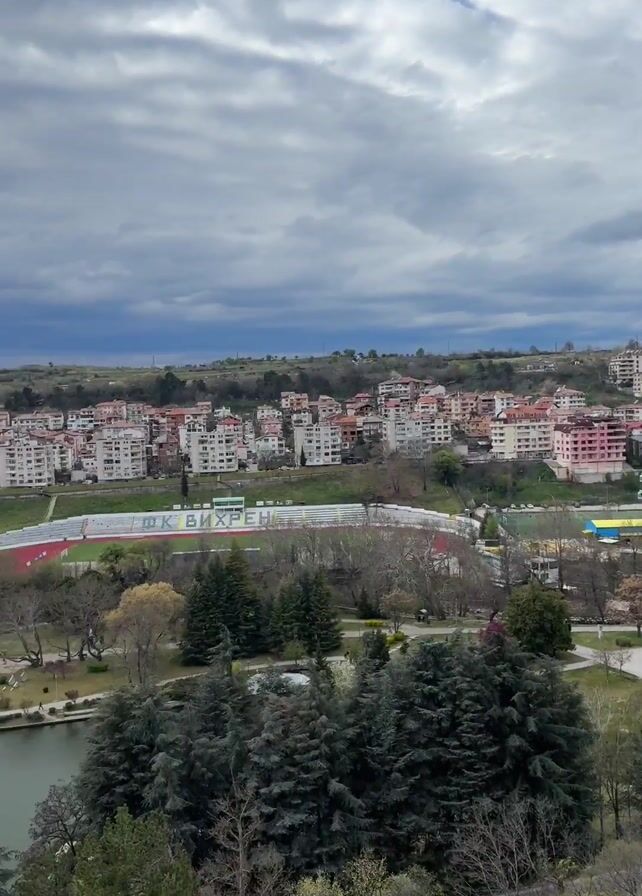 The video presents a panoramic view of a town nestled amidst rolling hills, under a cloudy sky