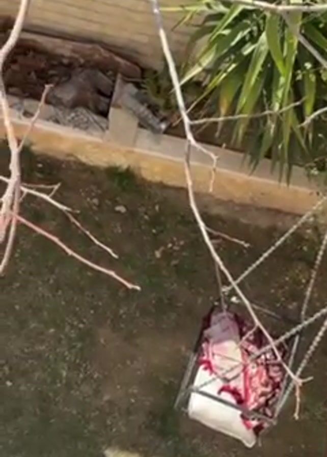 n outdoor scene from an elevated perspective, likely a balcony or upper floor. In the foreground, branches of a bare tree frame the view. Below, there is a small patch of green grass. To the right, a metal framed swing, suspended by chains, sits motionless, containing a white pillow and a maroon patterned blanket. Behind the grass patch, there is a low retaining wall of light-colored bricks. Behind the wall are some green plants and some discarded materials. The light suggests it is daytime.