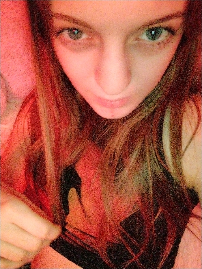 The image displays a close-up, high-angle portrait of a single female subject. Her face is centered, with light-colored eyes looking directly forward. Long, light brown hair frames her face and extends over her shoulders. She wears a dark-colored garment, possibly a tank top or camisole. Her right hand is visible in the lower left quadrant of the frame, appearing to grasp or adjust strands of her hair. The background is indistinct and uniformly blurred, showing a reddish-orange hue on the left and a lighter, undefined surface on the right, indicating an indoor setting with ambient red lighting. No discernible features identify a specific location within a city or country.
