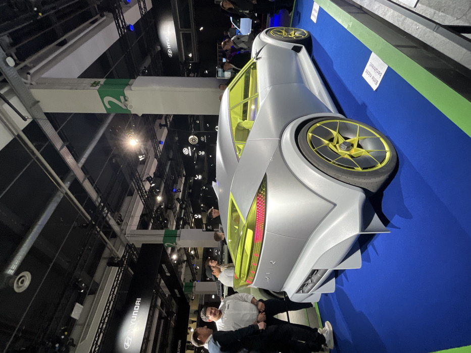An indoor photograph depicts a futuristic grey concept car, featuring bright neon yellow-green windows, interior accents, and multi-spoke wheel designs