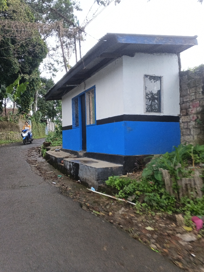 The scene depicts an outdoor environment in Masaiti, Zambia, under an overcast sky during daylight hours. A dark asphalt road, bordered by dirt and sparse vegetation, extends from the foreground into the mid-distance on the left. On the right, a small, single-story building stands elevated on a concrete foundation. Its exterior walls are painted white above a thin black band, which separates it from a bright blue lower section. The building has a dark, overhanging corrugated roof. Its visible facade features a partially open, dark door towards the left and a rectangular window with dark vertical bars towards the right, reflecting overhead foliage. To the right of the building, a stone wall is partially visible. The ground between the road and the building's foundation is overgrown with green vegetation and contains scattered debris, including a white pipe and pink plastic. In the left-midground, a single individual wearing a yellow shirt drives a dark blue scooter away from the camera along the road. Dense green trees and foliage are prominent in the background and along the roadside, with utility lines visible against the bright sky above.