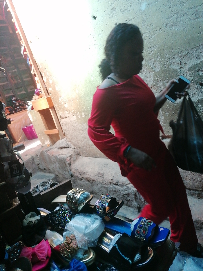 A woman in a red dress holds a phone and a black plastic bag, standing in front of a display of shoes. The footwear includes various styles, colors, and embellishments, such as bows, rhinestones, and metallic details. The setting appears to be an outdoor market with a wall and wooden structure visible in the background. Sunlight is shining through, creating bright areas and shadows.