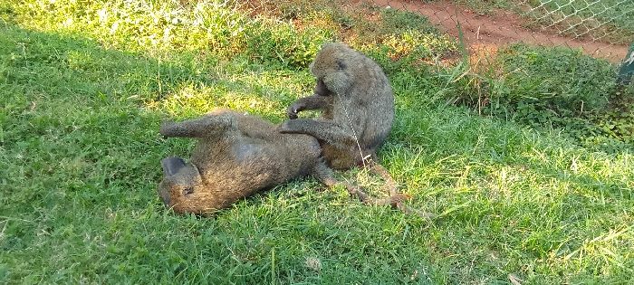 Two baboons are observed in a grassy outdoor environment within Athi River ward, Kenya. One baboon, exhibiting brownish-grey fur, lies supine, partially on its right side, with its head oriented towards the lower left of the frame. Its limbs are somewhat splayed across the grass. A second baboon, also with brownish-grey fur, is positioned sitting upright directly over the first, facing away from the camera. This upright baboon is actively engaging in grooming the recumbent animal, with its left forelimb extended towards the back of the prone baboon. A thin, light-colored fiber or string is draped from the sitting baboon's chest area, extending downwards towards the ground. The immediate environment consists of short, green grass, with taller vegetation and patches of reddish-brown soil visible in the background. A chain-link fence is present in the upper right background. The scene is illuminated by natural daylight, casting clear shadows.