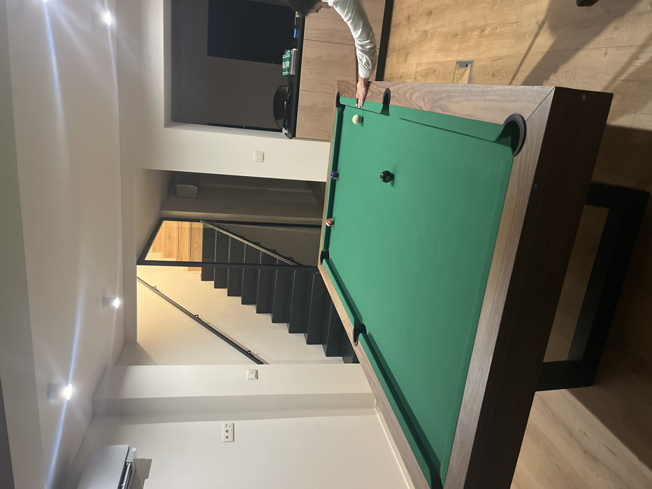 A billiard table dominates the frame, its green felt surface holding several balls. The table has a wooden frame with dark pockets. Behind it, a staircase leads to another level, illuminated by warm light. The staircase has dark steps and a handrail. The walls are white, and the flooring appears to be light-colored wood. A person's arm is visible near the table's edge. A television is mounted on a wall near the table.