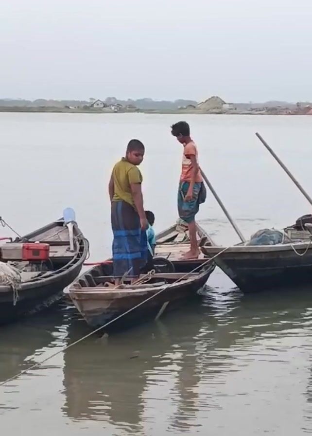 In a static, medium shot, several small wooden boats are docked, rocking slightly in the calm water. Three boys are standing on and around one of the boats. The first boy, wearing a green t-shirt and a blue and black sarong, stands in the middle of the boat, looking towards the camera. The second boy, wearing an orange and white striped shirt and a blue and green sarong, stands on the edge of the boat, holding a long wooden pole. A third boy, wearing a blue shirt, is partially visible, crouched down in the same boat. The boats are tied together and to a dock or shore. The background features a flat landscape with sparse vegetation and a few buildings, all under an overcast sky. The water reflects the grey sky, creating a muted, serene atmosphere.