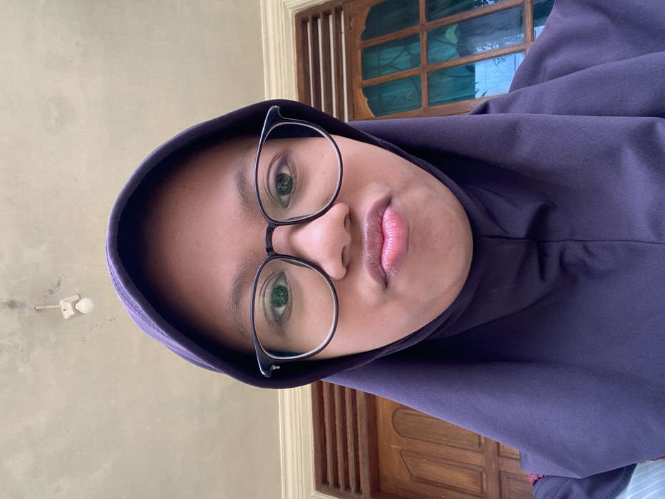 A person wearing glasses and a purple hijab is centered in the frame, gazing directly at the camera