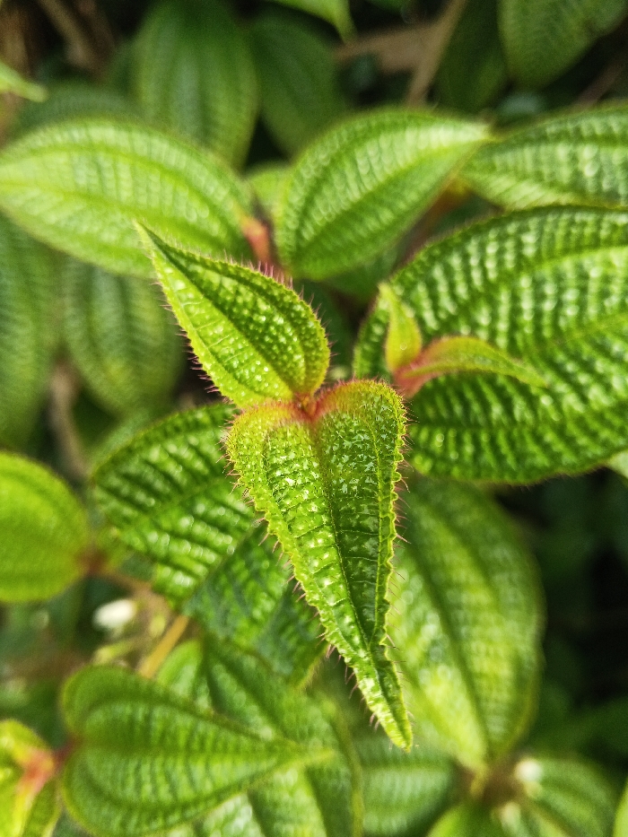 Lush, vibrant green leaves dominate the image. These leaves have a textured, slightly bumpy surface, with prominent parallel lines running across them. The edges of some leaves are lined with fine, reddish-pink hairs, adding a soft, delicate contrast to the bright green. The overall composition focuses on the intricate details and textures of the foliage.