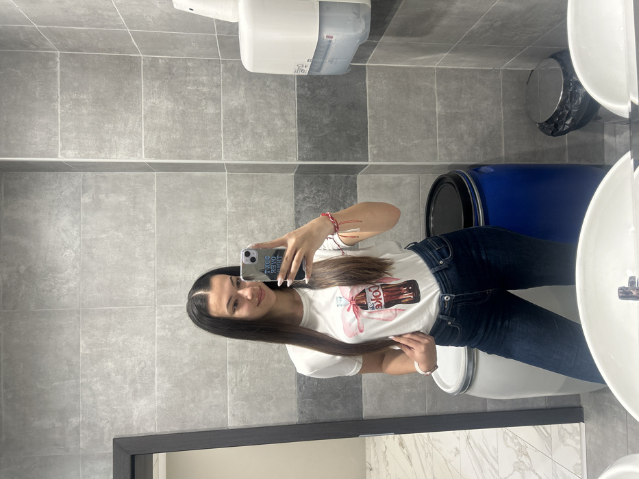 A mirror selfie depicts a young adult female inside a modern public restroom in Sofia, Bulgaria. The subject, with long, straight, dark brown hair parted down the middle, wears a white t-shirt featuring a Coca-Cola bottle graphic tied with a pink bow, and dark blue jeans. She smiles faintly while holding a smartphone in her right hand, angled to capture her reflection. The phone case, visible in reverse, reads "DON'T OVER THINK IT." A white wristband adorns her left wrist, and red and white braided bracelets are on her right. Her fingernails are long and light-colored. The restroom environment consists of walls covered in large rectangular grey tiles, segmented horizontally by a darker grey tile band. The floor is covered in light-colored, possibly marble-effect, tiles, visible on the left. In the foreground, two white ceramic sinks with chrome faucets are partially visible. A white wall-mounted paper towel dispenser with a clear viewing window is affixed to the right wall. Behind the subject, two large cylindrical containers, one white and one blue, both with black lids, stand on the floor. A smaller, metallic round trash can with a black liner is positioned to the right of the blue container. A dark-framed doorway or opening is reflected on the far left. The scene is illuminated by internal artificial lighting.