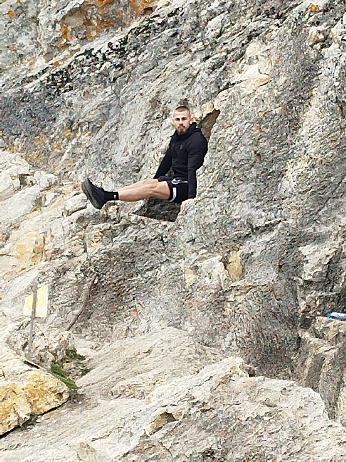 A male individual is observed in a rocky outdoor environment, located in the city of Efrem, Bulgaria. The subject, with short hair and a beard, is wearing a black hooded jacket, black shorts with a white vertical stripe and "NIKE" branding on the left leg, black socks, and black athletic shoes. A black climbing harness is visible around his waist. He is seated on a natural rock ledge, facing slightly left of the frame, with his legs extended straight forward and slightly elevated, parallel to the ground. His left arm is bent, and his right hand appears to be resting on the rock surface beside him. He looks directly forward. The immediate surroundings consist of weathered rock formations, varying in shades of grey and tan, indicative of a cliff face or steep incline. Below and to the left of the man, a narrow, unpaved trail or path is discernible, partially obscured by smaller rocks and sparse green vegetation. A small, yellow-topped marker or sign is present near this path. In the lower right corner of the frame, a small blue object, possibly a water bottle, rests on a rock surface. The overall scene depicts an active outdoor setting.