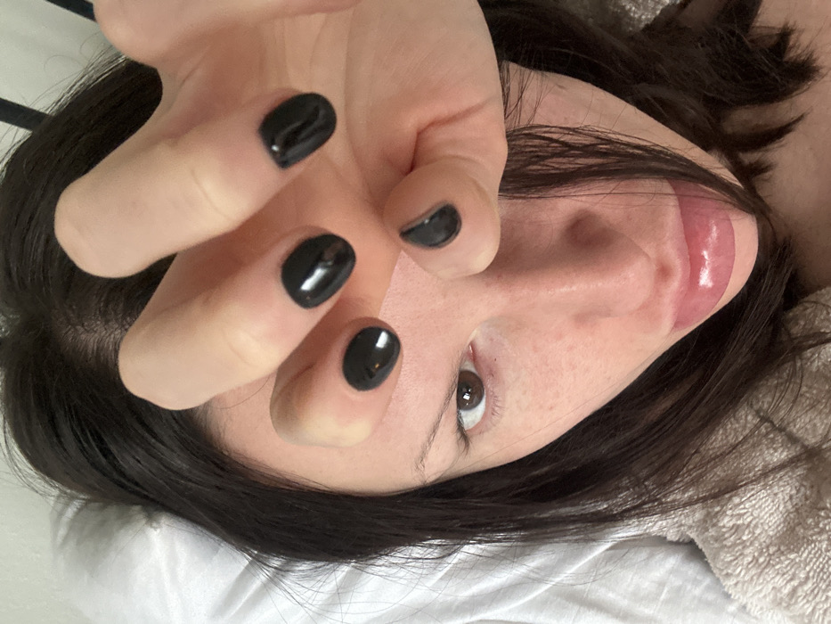 The image displays a close-up, high-angle view of a female individual in an indoor setting within the city of Wealden, United Kingdom. The subject has dark brown hair and is situated against white bedding, possibly a pillow or sheet. Her left hand is raised, partially obscuring the upper right side of her face. The visible fingernails on four fingers and the partial thumb are short, oval-shaped, and coated in glossy black polish. The visible facial features include a brown left eye, a portion of the nose, and full, glossy pink lips. A light-colored, possibly beige, terry cloth material is present on the lower left side of the frame. The individual's visible eye is directed towards the camera.