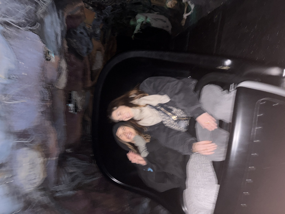Two adult females are seated in a dark-colored ride vehicle, likely within Phantom Manor at Disneyland Paris in Chessy, France