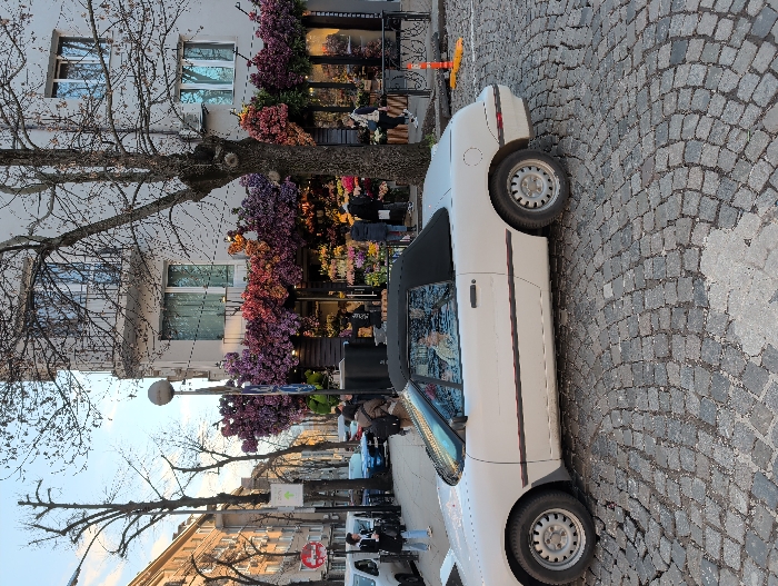 The image depicts an urban street scene in Sofia, Bulgaria, during daylight hours. In the immediate foreground, a white convertible car, featuring a black soft top in the raised position, is situated on a dark gray cobblestone street. A single individual is visible in the driver's seat. To the right, the ground floor of a multi-story building houses a commercial establishment, identifiable as a flower shop, characterized by an extensive, multi-colored artificial floral facade. This facade comprises dense clusters of pink, purple, red, and orange artificial flowers arranged cascadingly above and around the shop's large display windows. Several pedestrians are present on the sidewalk directly in front of this shop, some appearing to observe or interact with external floral displays. A bare deciduous tree stands between the street and the shop entrance. To the left and extending into the background, the cobblestone street continues, bordered by multi-story residential or commercial buildings. A white van and a blue passenger vehicle are parked on the left side of the street. Additional pedestrians are visible on the sidewalk. Street furniture includes a tall streetlight with a spherical lamp head and various road signs, specifically a red circular "no entry" sign and a white square sign with a green upward-pointing arrow. The surrounding environment includes multiple bare deciduous trees, indicating a non-summer season. The sky above shows a mix of light blue and white clouds.