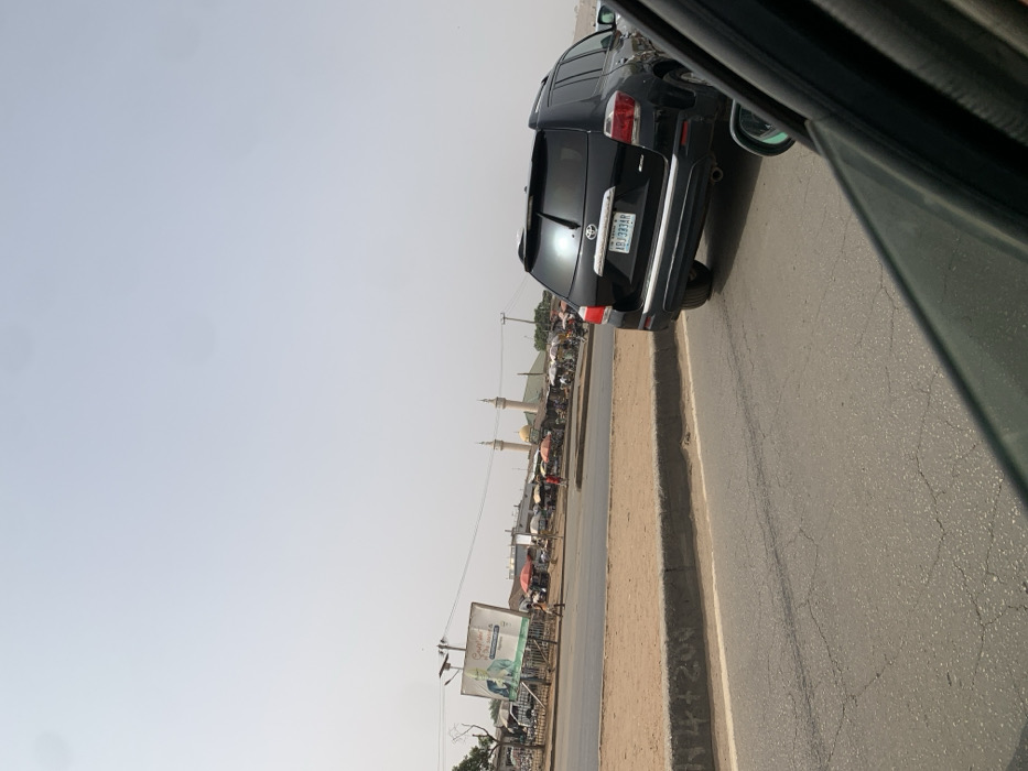 The image depicts a street scene in Nyanya, Nigeria, viewed from the interior of a vehicle, looking forward-right. The immediate foreground shows a cracked asphalt road surface and a concrete curb with "N 4+20" inscribed. A dark-colored Toyota Highlander SUV, bearing Nigerian license plate ABJ 333AR, occupies the central-right, oriented away from the viewer; its rear window reflects a bright light source. The extreme right foreground captures a portion of a tinted vehicle window. Across a sand-covered median to the left, a bustling market area is visible. Numerous individuals, including adults and children, are present, some walking, others near stalls. Market stalls feature various colored awnings, primarily red, white, and yellow. Motorcycles are observed within the market vicinity. A large billboard, partially displaying "Cooperative..." and an image of a person, stands to the left. In the background, beyond the market, two light-colored mosque minarets with golden dome tops are prominent, alongside a larger golden dome structure. The sky is hazy and light-colored, with power lines and poles visible.