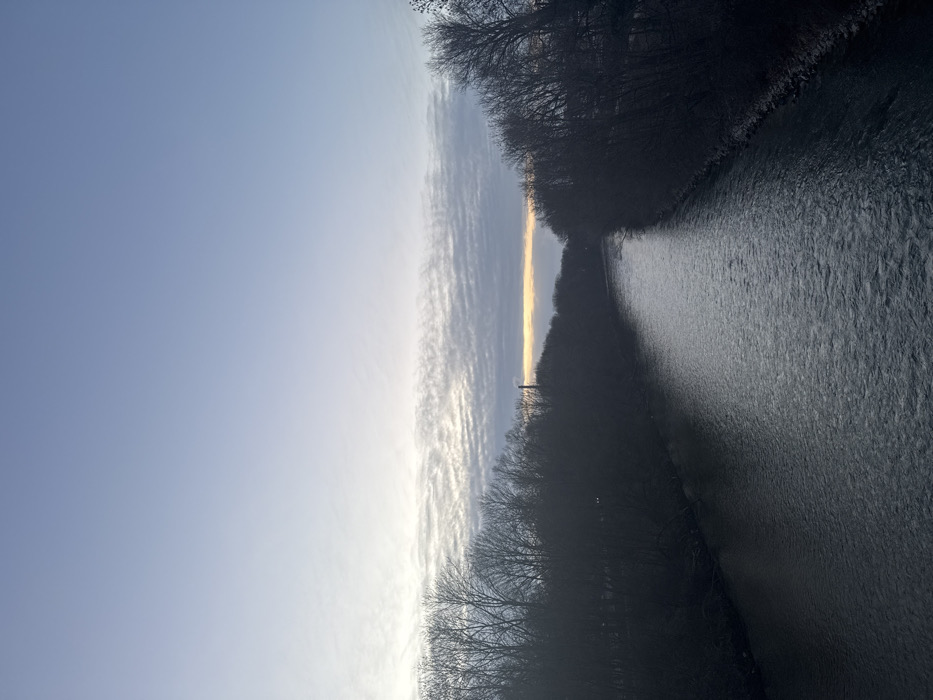 The image displays a wide, elevated view of a river flowing through a natural and semi-industrial landscape in Augsburg, Germany. The scene is captured during either sunrise or sunset, indicated by a horizontal band of bright orange and yellow light on the distant horizon, beneath a layer of textured, horizontally elongated altocumulus clouds. The upper sky is a clear, light blue. The central feature is a dark, moderately rippled river, which flows from the immediate foreground towards the distant horizon, reflecting the muted overhead light. Both banks of the river are densely covered with dark, bare deciduous trees, indicative of winter or early spring. These trees form a prominent, dark silhouette against the brighter sky and distant horizon. On the left bank, slightly above the tree line and positioned roughly one-quarter from the left edge of the frame, a tall, slender industrial smokestack or chimney is visible, emitting a faint, light-colored plume that merges with the horizon clouds. No human figures are present in the frame. The scene is devoid of overt human activity or interaction.