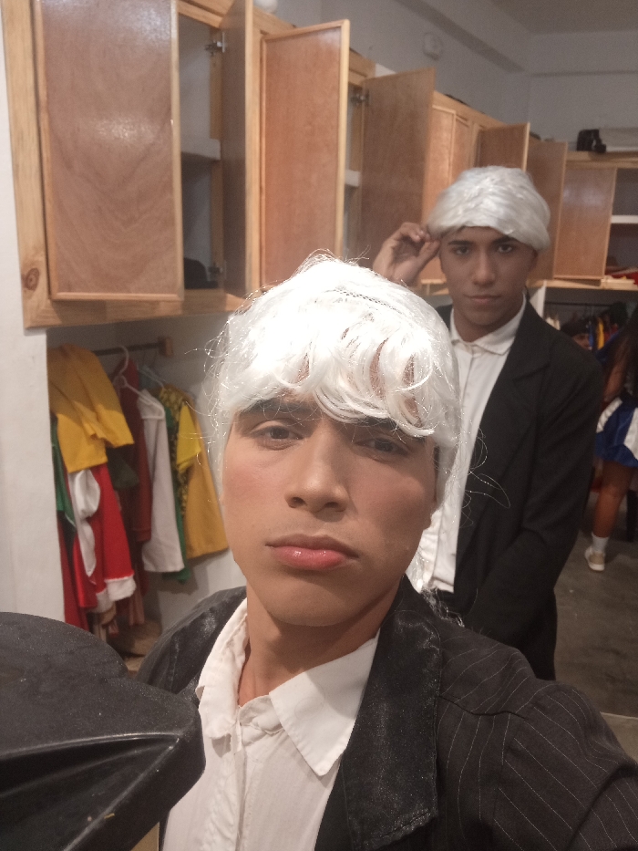 Two young individuals are dressed in white wigs and suits, possibly for a costume event. The person in the foreground is holding something resembling a fan or part of a costume accessory, while the person in the background is adjusting their wig. Behind them are wooden cabinets and a clothing rack with colorful garments. Another person in a blue dress is visible near the right edge of the frame. The scene appears to be backstage or in a dressing room area.