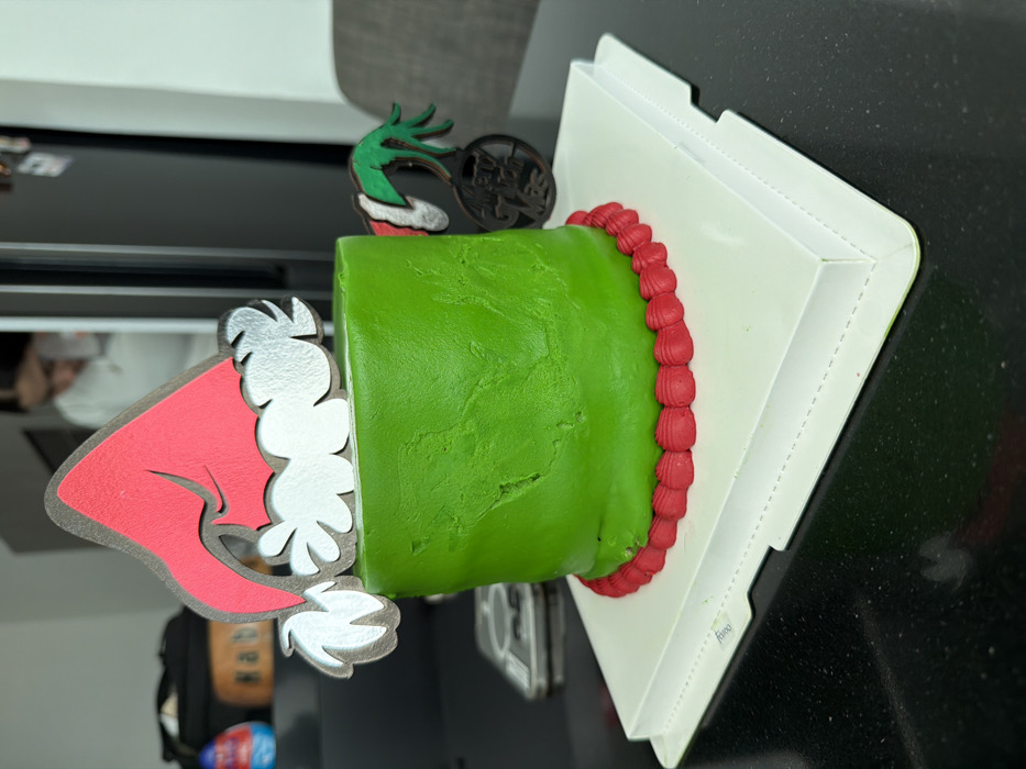 A green cake with red trim sits in a white box. It is decorated with a wooden Grinch-themed cake topper. One side shows the Grinch's red hat and white fur trim, while the other features his green hand holding a bag. The cake and box are on a black surface, likely a countertop. The image has been rotated to be portrait.