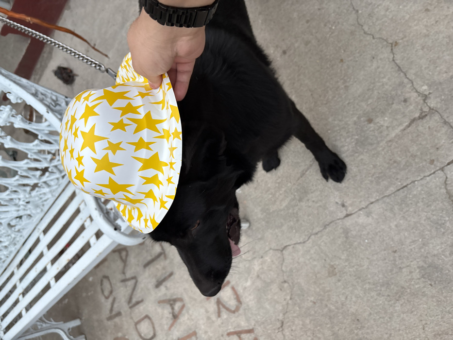 The image displays an outdoor scene in the city of Chamilpa, Mexico. A black dog, appearing to be a large breed, is positioned with its head turned to the left, mouth slightly open with a pink tongue visible. A white hat with a yellow star pattern is placed on the dog's head. A human right hand, wearing a dark-colored wristwatch, is holding the hat. In the background, a white, ornate metal bench with a slatted seat and decorative backrest is partially visible. The ground is a light gray concrete surface exhibiting cracks and faint, light-colored lettering, including "AND" and "TIA". A metal chain leash is partially visible in the upper right quadrant of the image.