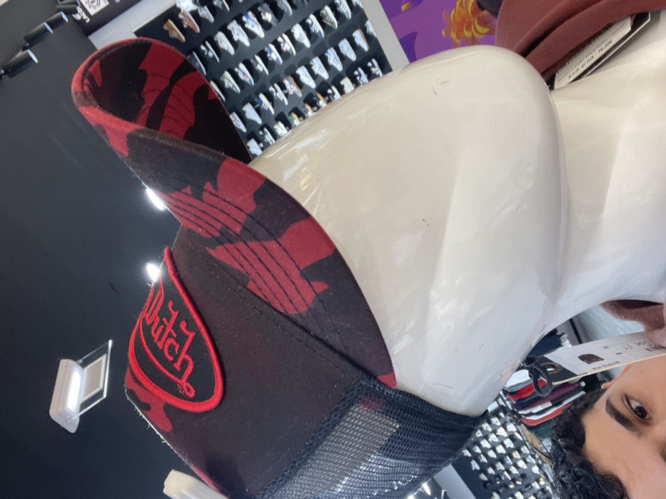 The image depicts the interior of a retail clothing and footwear store, identified as being located in Mirandela, Portugal. In the foreground, a white, featureless mannequin head and upper torso are angled to the right, wearing a black and red camouflage trucker cap. The cap features a black mesh back and a prominent red oval patch embroidered with "Dutch" in black stylized script on its front panels. Partially visible in the lower-left quadrant is the right eye and eyebrow of a person with dark, curly hair, indicating a selfie or first-person photographic perspective. A white retail tag, displaying "P.V.P. C.IVA: 70,00€", is visible near the person's face. The background reveals dark walls and ceiling, equipped with recessed square light fixtures. A wall-mounted display on the right exhibits multiple pairs of sneakers arranged in orderly rows. A partial "Lacoste" brand logo is discernable above the footwear display. To the left, a clothing rack containing various garments is partially visible. A segment of a colorful graphic or mural is present on the far right wall.