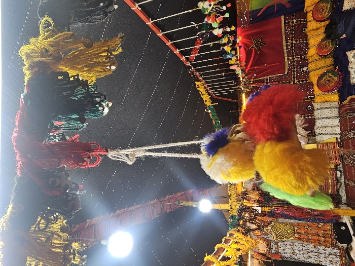 View looking up at a tent ceiling decorated with vibrant textiles and ornaments. Colorful yarns in red, green, yellow, and black hang on the left. Brightly colored, furry objects, including red, yellow, and green, are suspended in the center. A red Moroccan flag with a star hangs above. Decorated fabrics and textiles line the right side, and lights illuminate the scene from below.