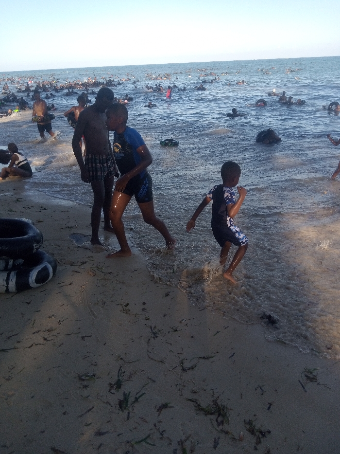 The image displays a crowded beach scene in Shanzu ward, Kenya
