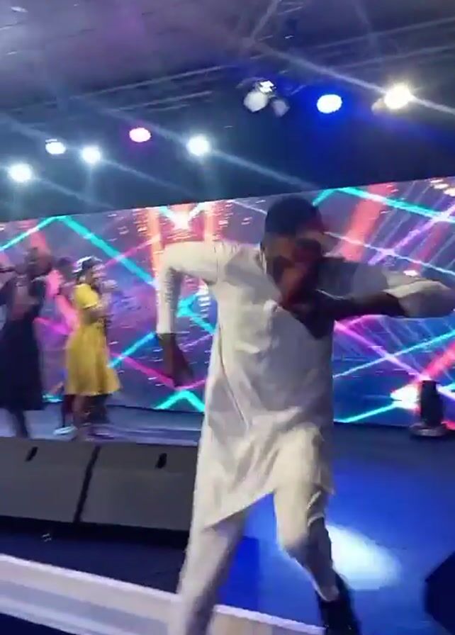 A man in a white outfit dances on the edge of a stage, then sits down and looks at the camera. Several singers are on stage behind him. The stage is decorated with lights and a large LED screen.