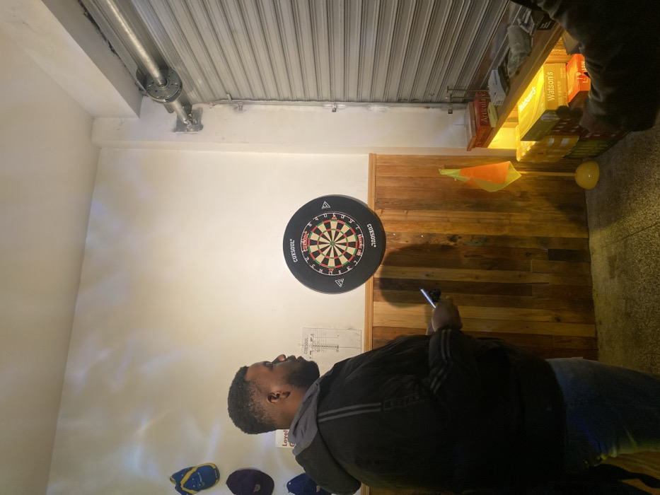 The scene is an indoor recreational area within the city of Liangjiang, China. A Black male individual, with a short beard and dark hair, stands in profile facing right, observing a dartboard. He is wearing a dark, puffy jacket with three horizontal stripes on the left arm and blue jeans. He holds a black smartphone in his left hand. A CUESOUL brand dartboard, featuring traditional red, green, and black segments, is mounted on a wooden-paneled wall. Above the wooden paneling, the wall is white. To the left of the dartboard, a blue flip-flop and two dark caps are affixed to the white wall, along with a white sheet of paper that may be a score card. To the right of the dartboard, a metal roller shutter is visible, suggesting an exterior or storage access point. A small, yellow and orange triangular flag on a yellow pole with a round base stands on the floor. Below the flag, a shelf illuminated by yellow light from underneath holds stacked boxes, including one labeled "Watson's" and another item partially labeled "Articulate." A second, unidentified individual's forearm and hand are visible in the bottom right corner, reaching towards these stacked items on the shelf. The floor is a light grey.